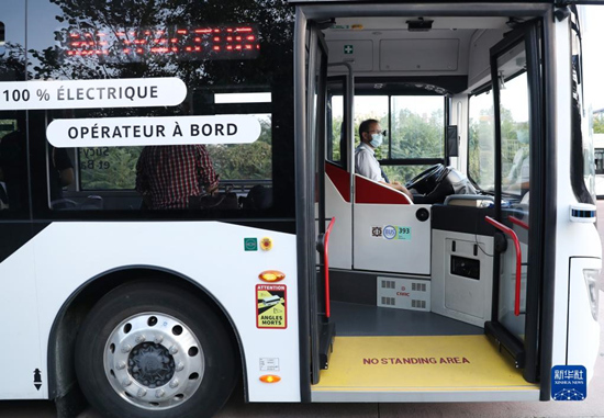 Un bus autonome fabriqué par l'entreprise chinoise CRRC Electric Vehicle mène des tests à Paris, en France, le 17 septembre 2021. (Gao Jing / Xinhua)