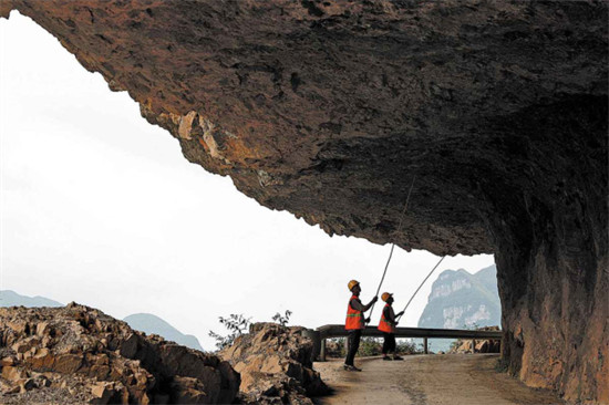 Huang Qifu (à gauche) et son collègue nettoient des roches en vrac le long de la route de la falaise menant au village de Shibanhe dans la ville de Bijie, dans la province du Guizhou (sud-ouest de la Chine) en 2019. (Han Xianpu / Capture d'écran sur Chinadaily.com.cn)