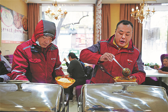 Deux livreurs prennent leur repas à un déjeuner-buffet de 12 yuans dans un point de service mis en place par un restaurant, le 7 novembre à Beijing. (Ju Huangzhong/Xinhua)