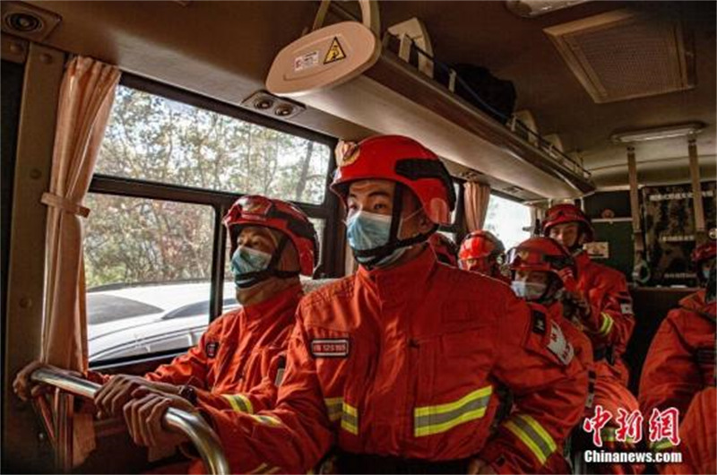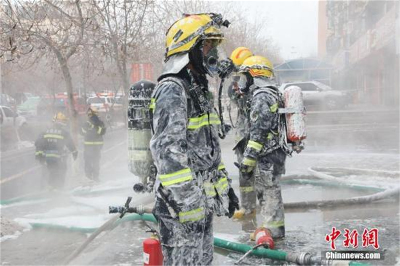 Début 2021, la température dans la ville de Karamay, dans la région autonome ou?ghoure du Xinjiang (nord-ouest de la Chine), est tombée à moins 24 degrés. Un incendie s'est déclaré dans un magasin de décoration automobile. Les pompiers ont immédiatement éteint le feu, avec de la glace épaisse sur leurs casques et leurs vêtements. (Wang Fengfei/China News Service)