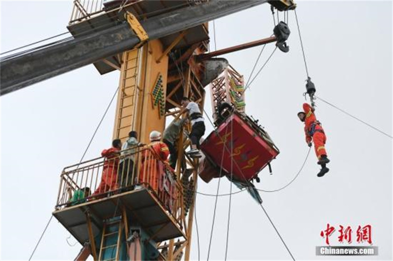 Le 9 mai 2017, dans la ville de Taiyuan, capitale de la province du Shanxi (nord de la Chine), une installation de divertissement du parc de Yingze est soudainement tombée en panne, bloquant 4 personnes dans l'air. Après un sauvetage d'urgence par des pompiers, les 4 personnes ont finalement été secourues. (Wei Liang/China News Service)