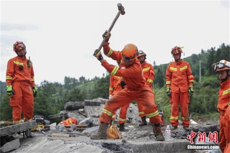 Un détachement des pompiers de Guiyang a effectué un sauvetage sur les lieux d'un glissement de terrain à Songtao, dans la province du Guizhou, le 9 juillet 2020. (Qu Honglun/China News Service)