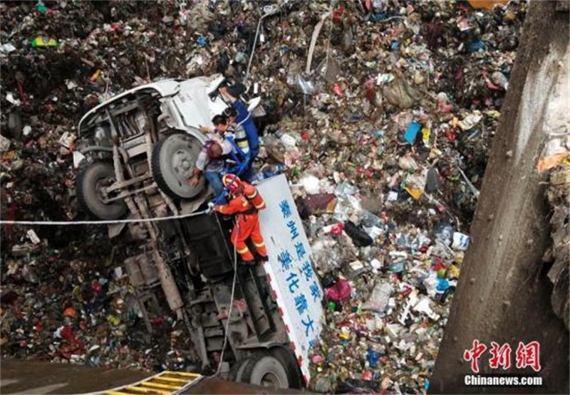 Des pompiers portant des appareils respiratoires à air se sont enfoncés au fond d'une fosse à ordures pour secourir des personnes, à Tianshui, dans la province du Gansu (nord-ouest de la Chine), le 5 ao?t 2018. (Hu Shengfe/China News Service)