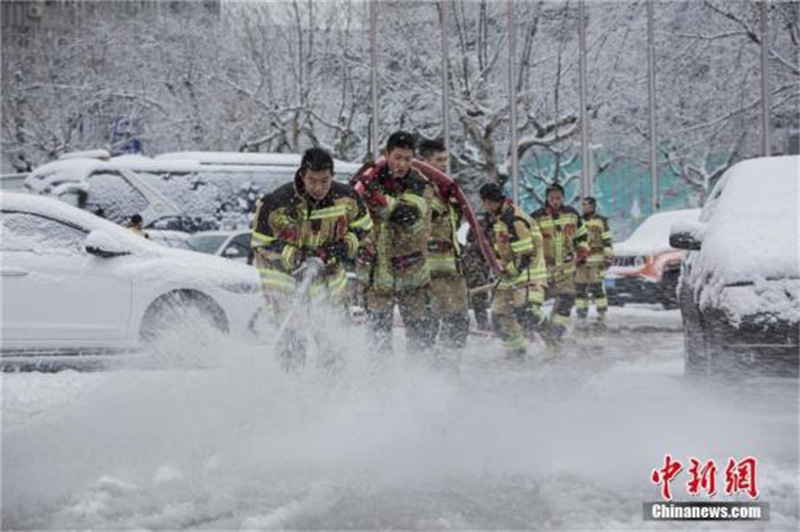 Le 26 janvier 2018, des pompiers de l'escadron du lac de l'Ouest de la ville de Hangzhou, capitale de la province du Zhejiang (est de la Chine) ont déblayé la neige. (Jian Lele/China News Service)