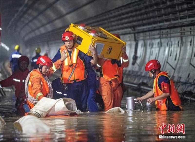 Le 26 juillet 2021, des pompiers de la ville de Wuhan, capitale de la province du Hubei (centre de la Chine) se sont précipités pour drainer l'eau accumulée dans le métro de la ville de Zhengzhou, capitale de la province du Henan (centre de la Chine). (Ai Shiyang/China News Service)