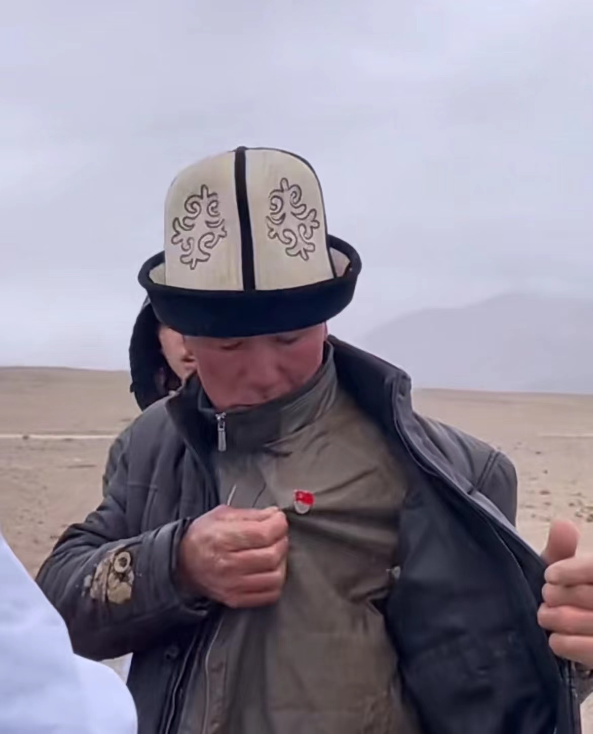 Abdujiapaer Mengde montre son emblème du Parti sur sa poitrine. (Photo/Capture d'écran de la vidéo)