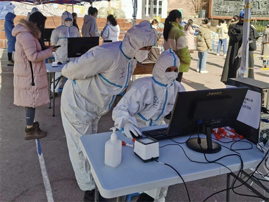 Vêtue d'un vêtement de protection, Mme Wu s'est rapidement mise à un travail de prévention : guider pour le scan des codes, vérifier les informations, passer les tubes à essai... Après plus de trois heures de travail bénévole, elle ne s'est pas arrêtée et s'est rendue à l'entrée ouest du campus pour aider au travail de sécurisation.
