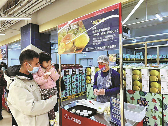 Des consommateurs achètent des poires au magasin de gros Freshippo Business Group-X à Suzhou, dans la province du Jiangsu (est de la Chine). (Photo/China Daily)