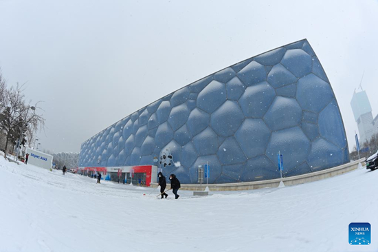 Photo prise le 13 février 2022 montrant le paysage enneigé du Centre aquatique national de Beijing. (Photo/Xinhua)