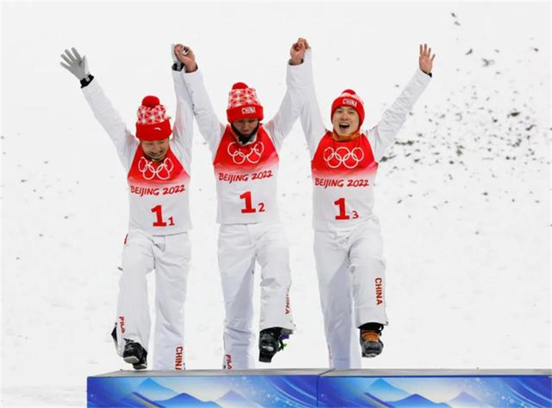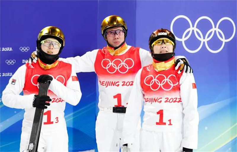 Le 10 février, l'équipe chinoise composée de Jia Zongyang (au milieu), Xu Mengtao (à droite) et Qi Guangpu après la finale de saut acrobatique par équipe mixte en ski acrobatique, dans le Parc de saut acrobatique et bosses de Genting, dans le district de Chongli à Zhangjiakou, dans la province du Hebei (nord de la Chine). (Fei Maohua / Xinhua)