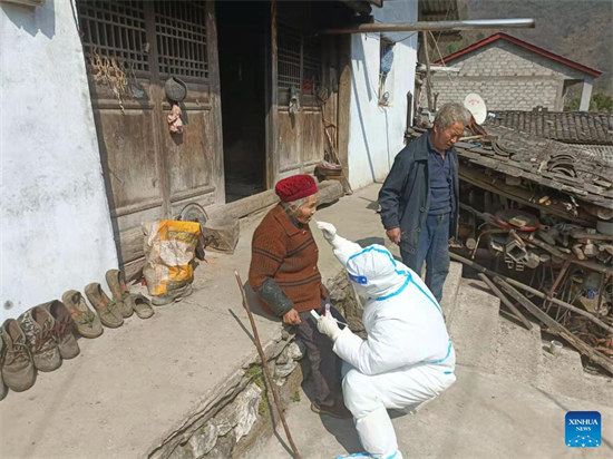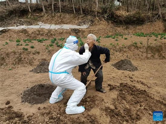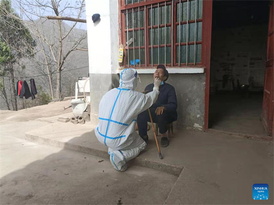 Le docteur Liu Jia prélève un échantillon sur le villageois Zhang Fuye pour un test d'acide nucléique dans le village de Peijiazhuang du comté de Lueyang, à Hanzhong, dans la province du Shaanxi (nord-ouest de la Chine), le 11 mars 2022. (Photo/Xinhua)