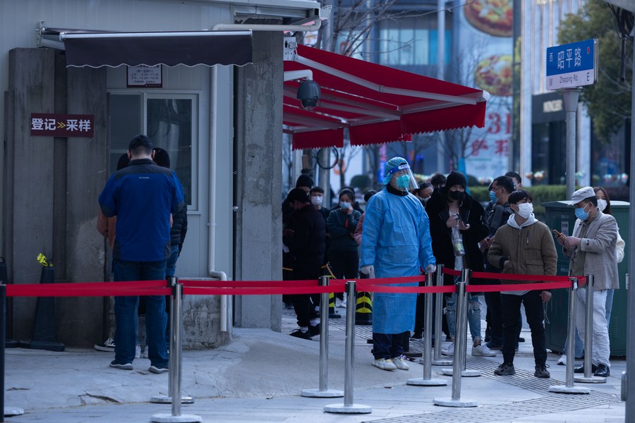 Des gens font la queue pour un dépistage dans un site de test à Xuhui, arrondissement de Shanghai, municipalité de l'est de la Chine, le 29 mars 2022. (Xinhua / Jin Liwang)