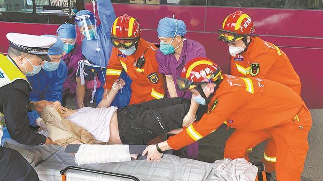 Un homme blessé a été sauvé et rapidement envoyé à l'h?pital pour y être pris en charge. (Photo fournie par la brigade des pompiers de du Guangzhou)