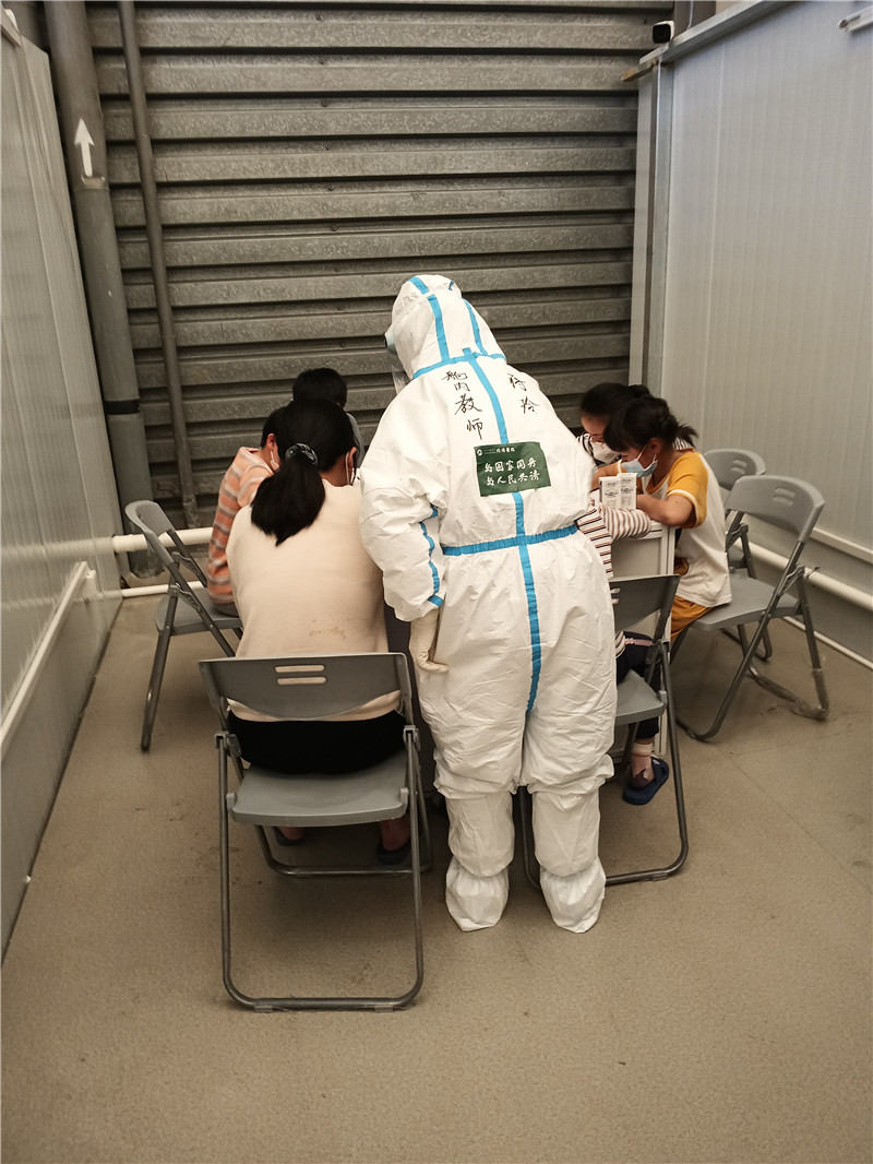 Des tuteurs de doctorat en médecine ? en train de guider les devoirs des enfants dans la cabine W2 au Nouveau Centre international des expositions de Shanghai. (Photo publiée avec l'aimable autorisation de l'h?pital Tongji affilié à l'Université des sciences et technologies de Huazhong)
