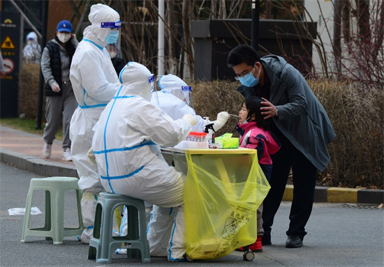 Un professionnel médical prélève un échantillon sur écouvillon à une fillette pour un test d'acide nucléique sur un site de dépistage de la COVID-19, à Changchun, dans la province chinoise du Jilin (nord-est), le 14 avril 2022. (Xinhua/Zhang Jian)