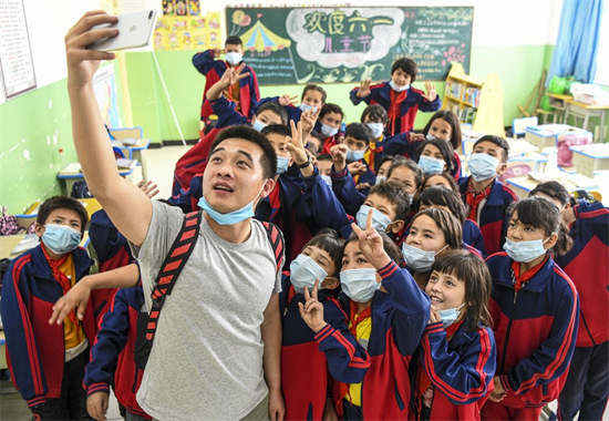 L'enseignant bénévole Ma Kun prend un selfie avec des élèves d'une école primaire du district de Tawakule, à Hotan, dans la région autonome ou?goure du Xinjiang (nord-ouest de la Chine), le 18 mai 2020. (Xinhua/Wang Fei)
