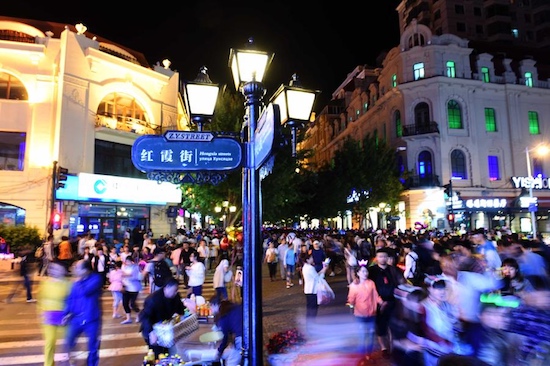 Des habitants et des touristes se promènent sur la rue centrale de Harbin, capitale de la province du Heilongjiang du nord-est de la Chine. (Photo / Xinhua)