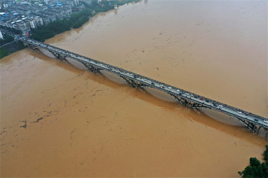 Photo aérienne prise le 4 juin 2022 montrant une vue de la rivière de Rongjiang après de fortes précipitations dans le district autonome Miao de Rongshui de la région autonome Zhuang du Guangxi, dans le sud de la Chine. (Xinhua/Huang Xiaobang)