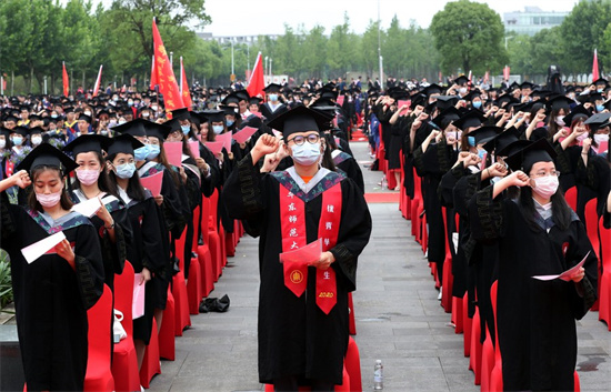 Des dipl?més universitaires spécialisés en éducation prêtent serment lors de la cérémonie de remise des dipl?mes à l'Ecole normale de l'est de Chine, à Shanghai, le 23 juin 2020. (Xinhua/Liu Ying)