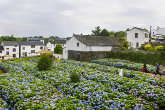 Des touristes parmi les fleurs prennent des photos dans le village de Luojiakeng du bourg de Qiangjiao du comté de Ninghai de la ville de Ningbo de la province du Zhejiang (dans l'est de la Chine). (Hu Xuejun / Pic.people.com.cn)