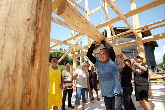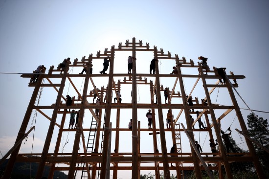 La saison creuse estivale est une bonne période pour établir la structure principale de nouvelles maisons dans le village Miao du comté de Danzhai. Il s'agit d'un signe important de l'achèvement essentiel d'une maison de l'ethnie Miao, qui consiste surtout à assembler et à consolider les pilotis. En ce moment, tous les habitants du village viennent aider leurs voisins pour construire ensemble une nouvelle maison sur pilotis.