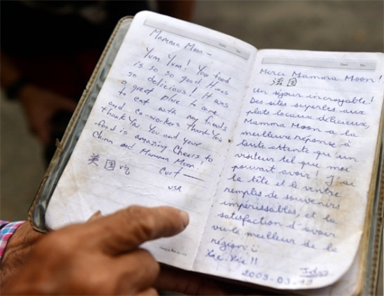 Au début, Madame Xu ne pouvait demander aux touristes étrangers qu'en chinois : ? Voulez-vous de l'eau ? ?. Plus tard, elle a préparé un petit cahier et chaque fois qu'elle communiquait avec des étrangers, elle notait chaque mot qu'elle avait entendu et si elle ne comprenait pas certains mots, elle demandait conseil aux visiteurs étrangers et notait aussi leur explication pour la réciter. Elle a ainsi utilisé un petit cahier après l'autre, sur lequel son expérience d'apprentissage était densément enregistrée. Elle vendait de l'eau pendant la journée, et le soir chez elle, elle profitait de tout son temps libre pour réciter ce qu'elle avait appris.
