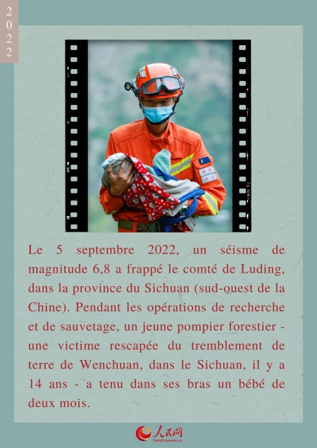 Le 5 septembre 2022, un séisme de magnitude 6,8 a frappé le comté de Luding, dans la province du Sichuan (sud-ouest de la Chine). Pendant les opérations de recherche et de sauvetage, un jeune pompier forestier - une victime rescapée du tremblement de terre de Wenchuan, dans le Sichuan, il y a 14 ans - a tenu dans ses bras un bébé de deux mois.