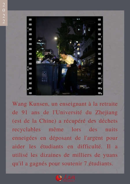 Wang Kunsen, un enseignant à la retraite de 91 ans de l'Université du Zhejiang (est de la Chine) a récupéré des déchets recyclables même lors des nuits enneigées en déposant de l'argent pour aider les étudiants en difficulté. Il a utilisé les dizaines de milliers de yuans qu'il a gagnés pour soutenir 7 étudiants.