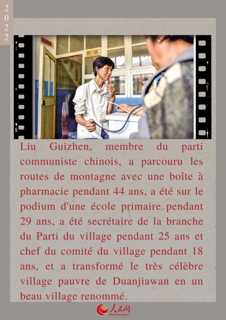 Liu Guizhen, membre du parti communiste chinois, a parcouru les routes de montagne avec une bo?te à pharmacie pendant 44 ans, a été sur le podium d'une école primaire pendant 29 ans, a été secrétaire de la branche du Parti du village pendant 25 ans et chef du comité du village pendant 18 ans, et a transformé le très célèbre village pauvre de Duanjiawan en un beau village renommé.