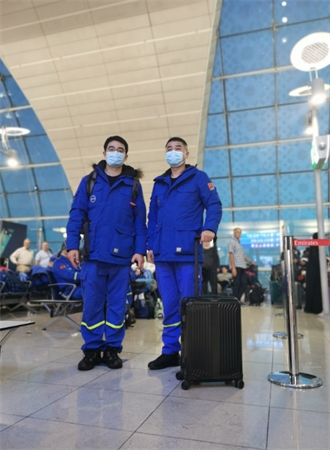 Zhang Yunlu, le chef de l'équipe de sauvetage Blue Sky de Yangzhou, et Dai Xiaodong, membre de l'équipe, arrivent à l'aéroport d'Istanbul, en Turquie. (Photo fournie par Zhang Yunlu)