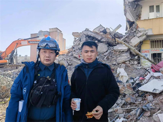 Wang Kaibo (à gauche) et Ma Jiayao (à droite) participent à une mission de sauvetage en Turquie. (Photo fournie par l'interviewé)