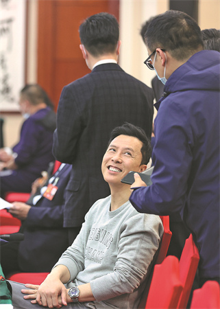 Donnie Yen s'entretient avec d'autres membres du secteur culturel du Comité national de la CCPPC lors d'une table ronde le 5 mars à Beijing. (Jiang Dong / China Daily)