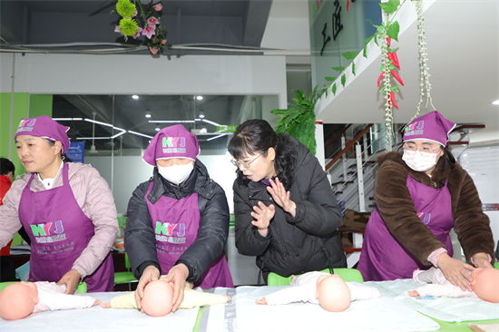 Gao Ruihua, députée à la 13e Assemblée populaire nationale, forme des employés aux soins aux bébés à Nanjing, capitale de la province du Jiangsu. (Photo / Xinhua)