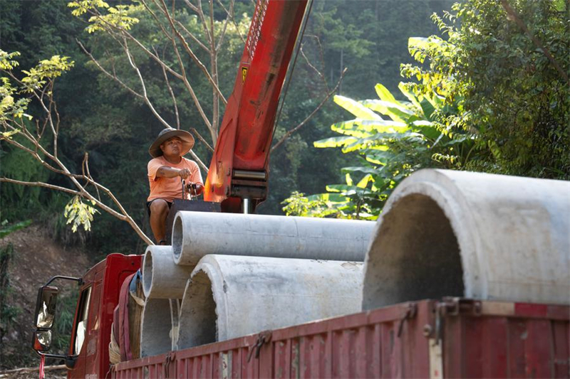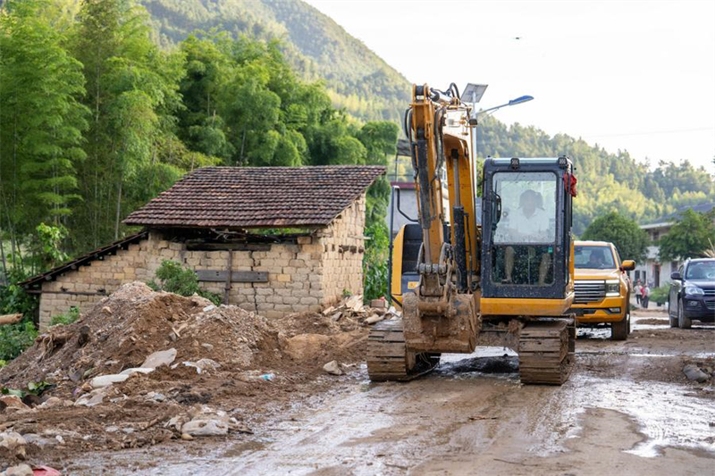 | Des ouvriers réparent une route endommagée dans le bourg de Bailang, à Zixing, dans la province chinoise du Hunan (centre), le 7 ao?t 2024. (Photo : Chen Sihan) |