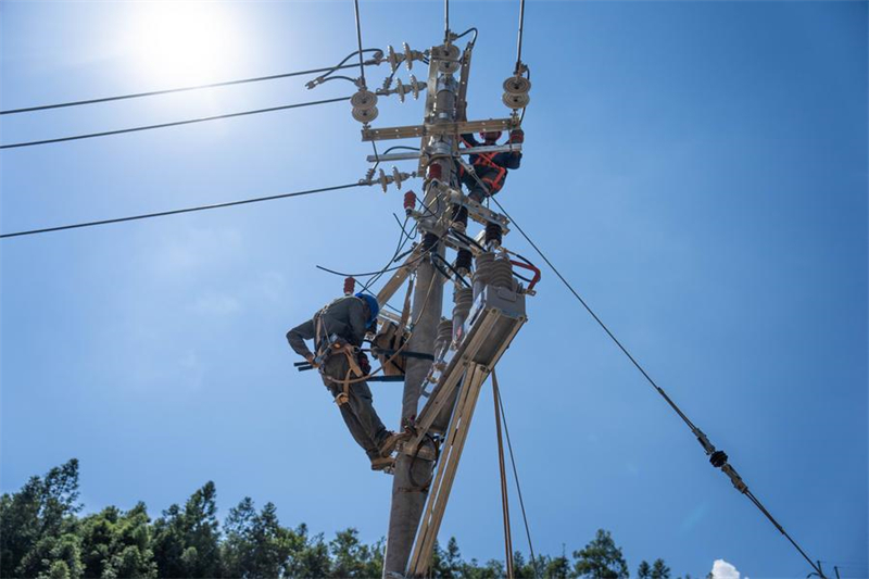| Des ouvriers réparent des installations électriques dans le bourg de Zhoumensi, à Zixing, dans la province chinoise du Hunan (centre), le 7 ao?t 2024. (Photo : Chen Sihan) |