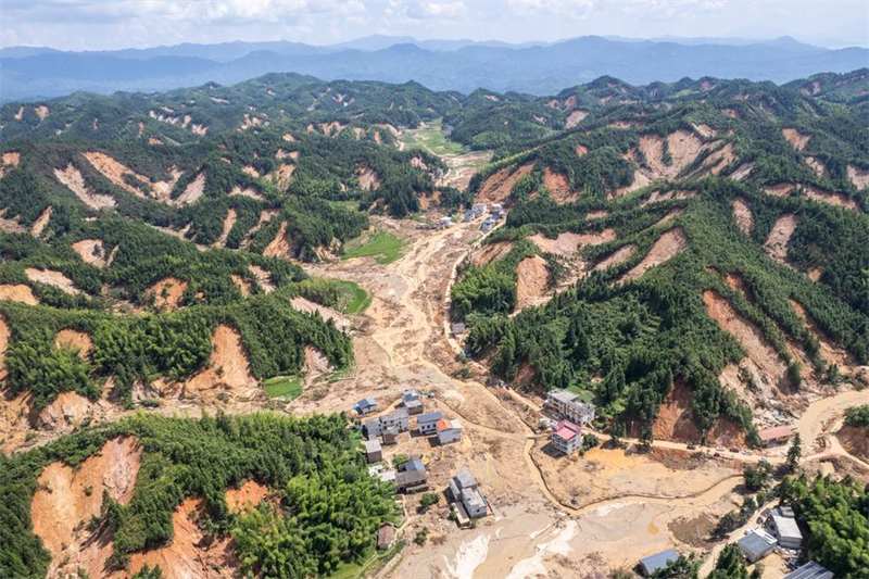 | Photo prise par un drone de zones sinistrées dans le bourg de Zhoumensi, à Zixing, dans la province chinoise du Hunan (centre), le 7 ao?t 2024. (Photo : Chen Sihan) |