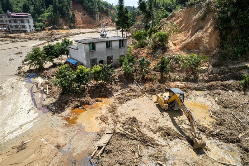| Photo prise par un drone de secouristes déblayant la boue près d'une maison dans le bourg de Zhoumensi, à Zixing, dans la province chinoise du Hunan (centre), le 7 ao?t 2024. (Photo : Chen Sihan) |