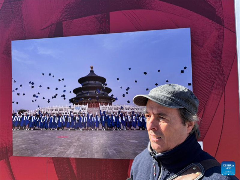 Debout devant une photographie géante, George Doupas, un photographe indépendant grec qui vit à Beijing, présente son ?uvre ? Happy Graduation ? à un visiteur. Sur l'image, un groupe de dipl?més universitaires en toge lancent leurs bonnets dans le ciel, avec le Temple du Ciel, l'un des monuments architecturaux de la capitale chinoise, en arrière-plan. ? J'adore les hutongs (ruelles), les siheyuan (cours carrées) et l'architecture ancienne de Beijing. Traditionnelles et vivantes ?, a-t-il déclaré.