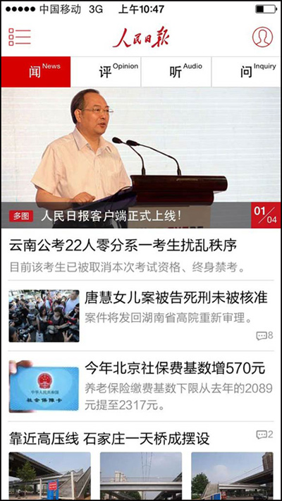 Le Quotidien du Peuple a lancé aujourd'hui son application mobile gratuite, qui offre aux utilisateurs un accès illimité au contenu. L'application mobile du journal ne se contentera pas seulement d'apporter l'ensemble du contenu papier sur plate-forme mobile, mais elle s'efforcera également d'entrer en contact avec les lecteurs et de les inciter à laisser des commentaires et à réagir avec l'application.