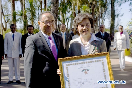 Xu Lin, directrice générale du Bureau de promotion internationale de la langue chinoise (Hanban) et directrice exécutive de l'Institut Confucius, en visite à Madagascar, a été décorée Officier de l'Ordre national malgache vendredi au bureau de Premier ministre malgache Dr Kolo Roger à Antananarivo, la capitale malgache.
