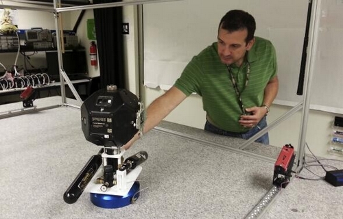 | Chris Provencher, chef de projet de Smart SPHERES, avec l’un des robots qui seront envoyés dans l’espace. |
