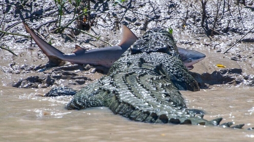 Un touriste australien a été laissé abasourdi après avoir vu un crocodile tenter d'avaler un requin. Andrew Paice, 43 ans, faisait une croisière d'une heure sur la rivière Adéla?de en Australie quand il a repéré quelque chose d'inhabituel dans la rivière.
