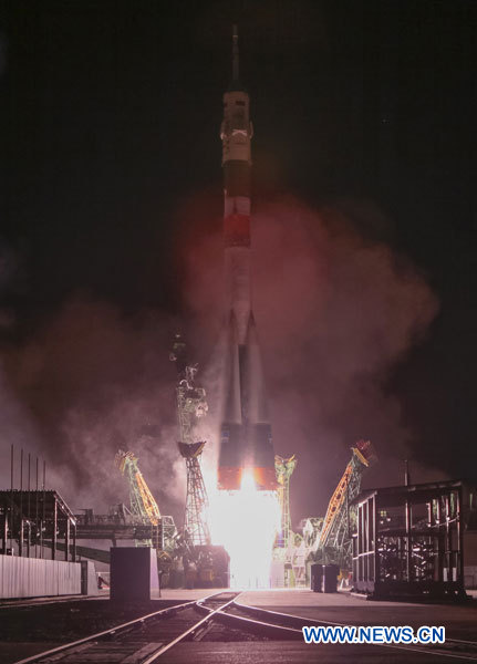 A bord du Soyouz se trouvaient le cosmonaute russe Anton Chkaplerov, Terry Virts de la NASA, et Samantha Cristoforetti, astronaute de l'Agence spatiale européenne, qui emmène avec elle une machine à café d'une vingtaine de kilos.