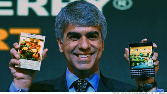 | Sunil Lalvani, Directeur général de BlackBerry India, montre le smartphone Passport. |