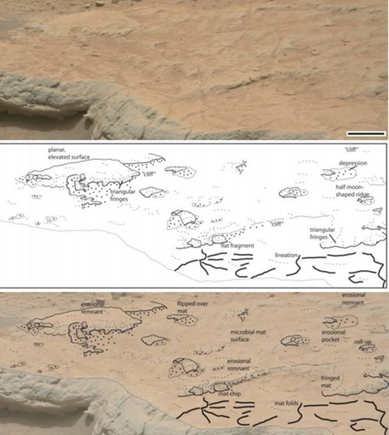 Quand la vie a évolué sur Terre, des couches de matière organique se sont réparties partout où l'humidité se trouver, laissant derrière des modèles induits par des microbes sur les rochers. Elle reconna?t qu'il est toutefois possible que les structures sur Mars aient été formées par l'érosion naturelle. ? Mais si les structures martiennes ne sont pas d'origine biologique ?, a ajouté Mme Noffke, ? alors les similitudes en termes de morphologie, mais aussi de modèles de distribution en ce qui concerne les structures sédimentaires induites par des microbes sur Terre serait une co?ncidence extraordinaire ?.