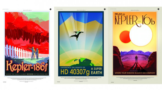 Si vous avez déjà rêvé de passer vos vacances en dehors de notre monde, la NASA vient de publier quelques affiches propres à nourrir votre imagination. Elles dépeignent des images de planètes nouvellement trouvées loin, très loin de la Terre. Le télescope spatial Kepler a repéré quelques exo-planètes hors de notre système solaire, et la NASA voulait les présenter au monde… elle a trouvé un moyen intéressant de nous les faire conna?tre. Elle a con?u des affiches transformant ces exo-planètes en lieux de vacances. Sur les plus de 1 000 exo-planètes découvertes par Kepler, la NASA, n'a créé des affiches pour seulement trois d'entre elles et les a présentées comme des attractions touristiques fictives.