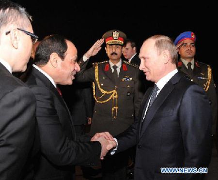 Accompagné d'une délégation de haut niveau, M. Poutine a été accueilli à l'aéroport international du Caire par son homologue égyptien Abdel Fattah al-Sissi.