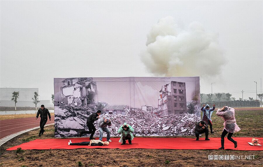 Da pollution atmosphérique reproduite lors d'un exercice sur le terrain simulant des secours médicaux d'urgence après un séisme dans la municipalité de Chongqing, dans le Sud de la Chine. Cette fumée est principalement composée de soufre, de sciure et d'additifs desséchants. Sa combustion produit du dioxyde de soufre avec une odeur acre. [Photo Liu Song / photoint.net]