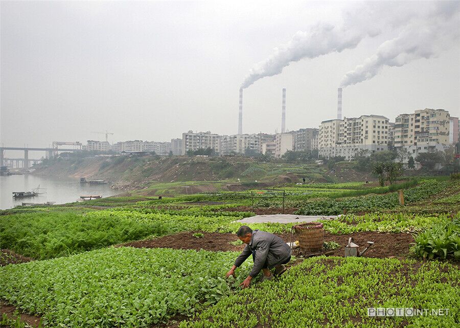 Un vieil homme cultive des légumes, tandis que la cheminée de la centrale électrique voisine fume dans la municipalité de Chongqing, dans le Sud de la Chine. [Photo Liu Song / photoint.net]