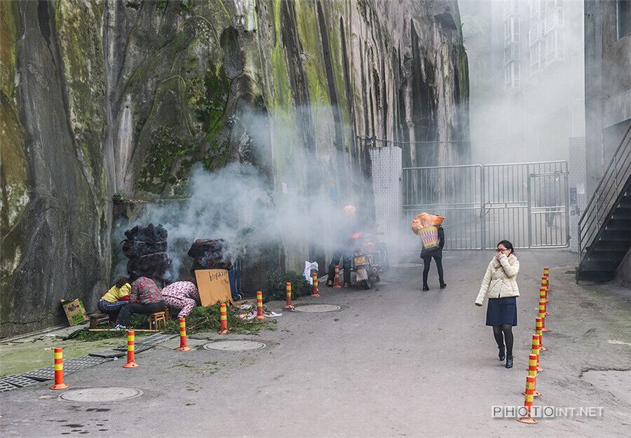 De la fumée produite par le fumage de saucissons à l'entrée d'un quartier résidentiel, qui a créé un chemin peu confortable pour les gens qui y vivent, dans la municipalité de Chongqing, dans le Sud de la Chine. [Photo Liu Song / photoint.net]